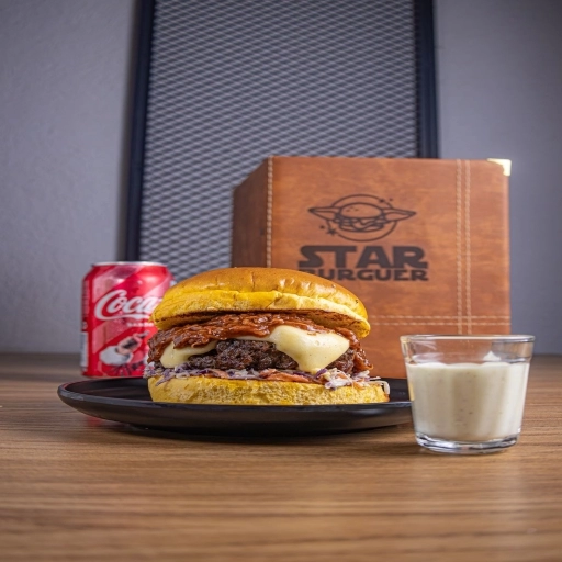 Burger de 150g, queijo cheddar, molho barbecue, bacon crocante, cebola caramelizada, pão de brioche e cebola crispy
