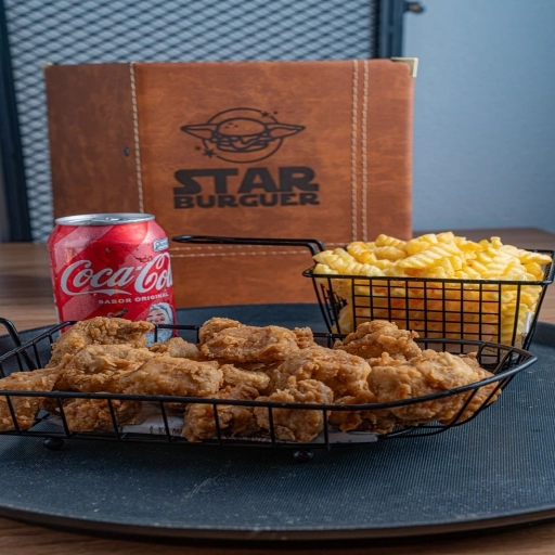 Filé de peito empanado, crocante por fora e macio por dento. Acompanha batata frita