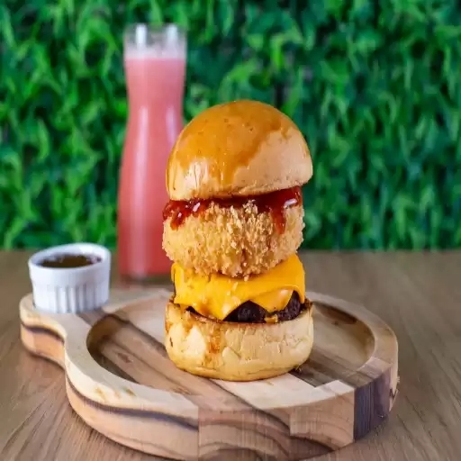 PÃO DE BRIOCHE, BUURGER 150G, QUEIJO MUSSARELA, BACON, QUEIJO COALHO SELADO, MEL, BANANA FRITA E MOLHO ESPECIAL